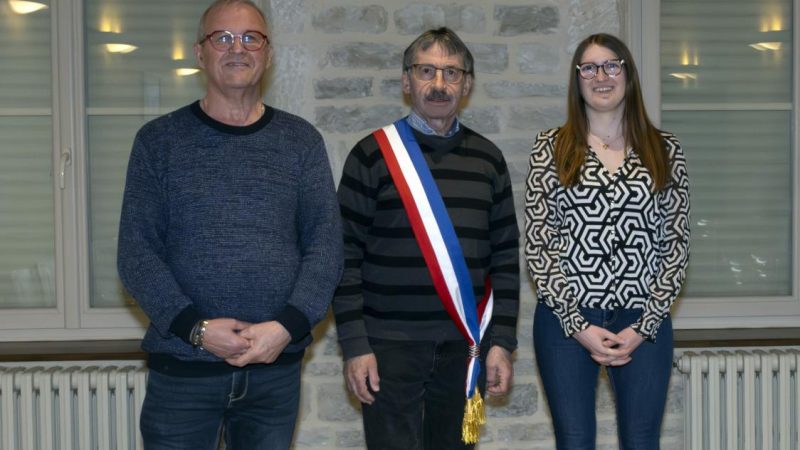 M. le maire Patrick MARY, entouré de ses adjoint.e.s : à gauche M. Bernard MICHEL, à droite Mme Margaux LASSAUT (photo L’Est-Eclair).