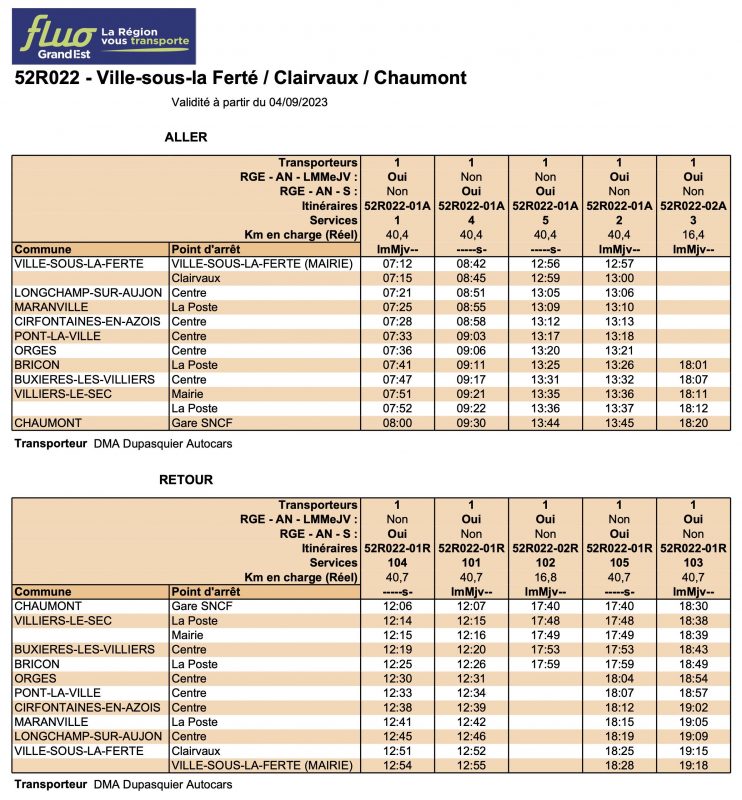 – Arrêt à Longchamp-sur-Aujon, n°12 rue de Maranville (D12), 4 dessertes/jour.