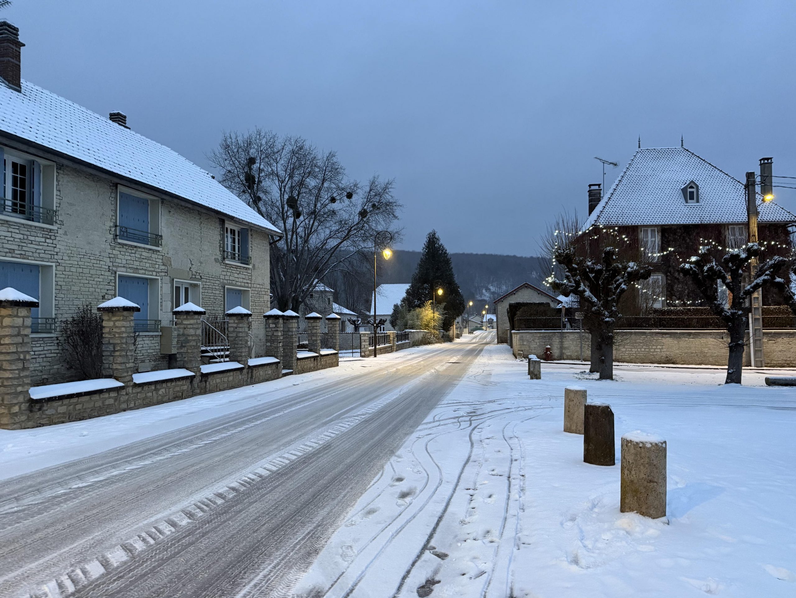 Au delà des difficultés de déplacement et de circulation avec des routes rendues glissantes, reste la beauté de l’instant, comme ici à la tombée de la nuit, entre chiens et loups.